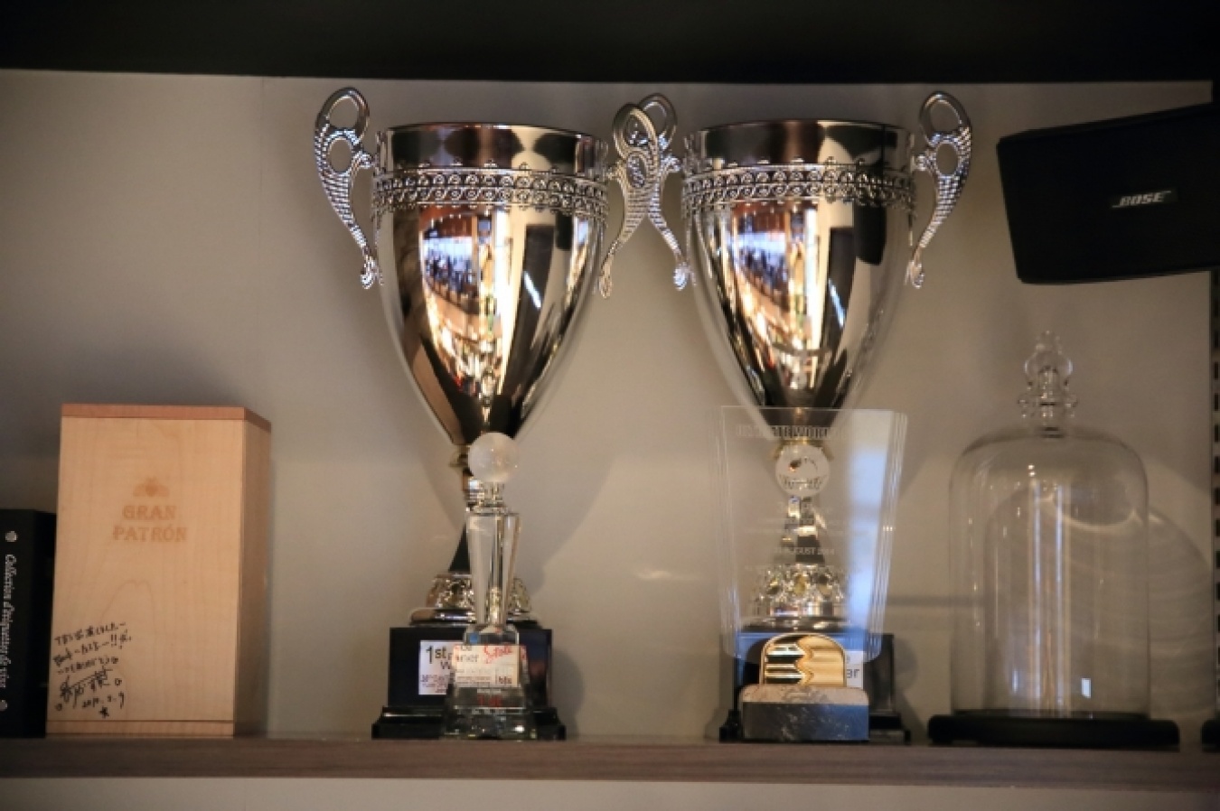 店内に飾られたトロフィーの数々。キャリア14年で獲得したタイトルは40以上!