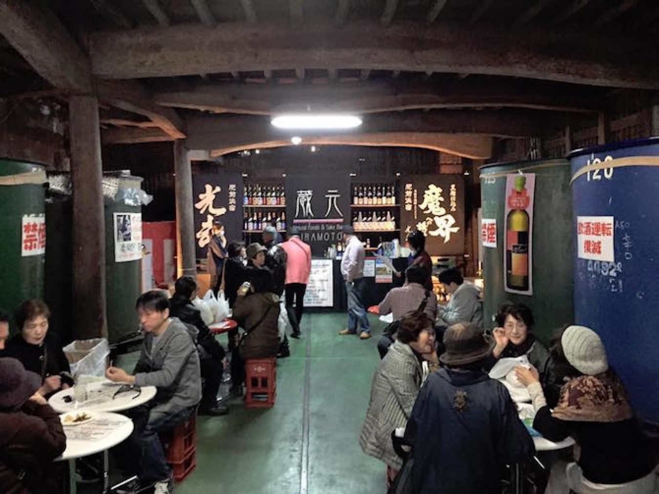 山本さんらがサポートするイベント、酒蔵バー。酒蔵の中にご覧のようなカウンターとバックバーを用意して地元のファンに和酒カクテルを振る舞う。