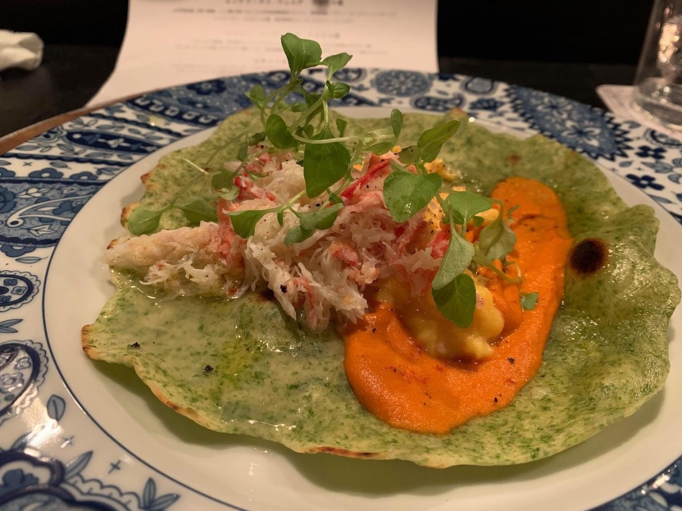 ある日の「エルフジヤマ」のメスカル・ペアリングの料理。ロメスコ・ソースでいただく、ズワイガニとスクランブルエッグのトルティーヤ仕立て。トルティーヤはセモリナ粉に青のりを加えてツイストしている。