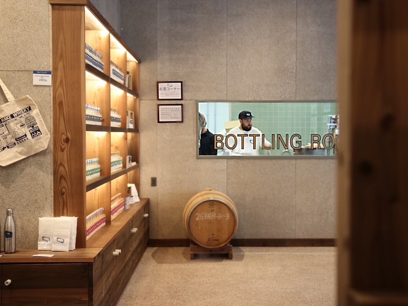 蒸留所内のショップスペースからボトリングの様子を見学できる。