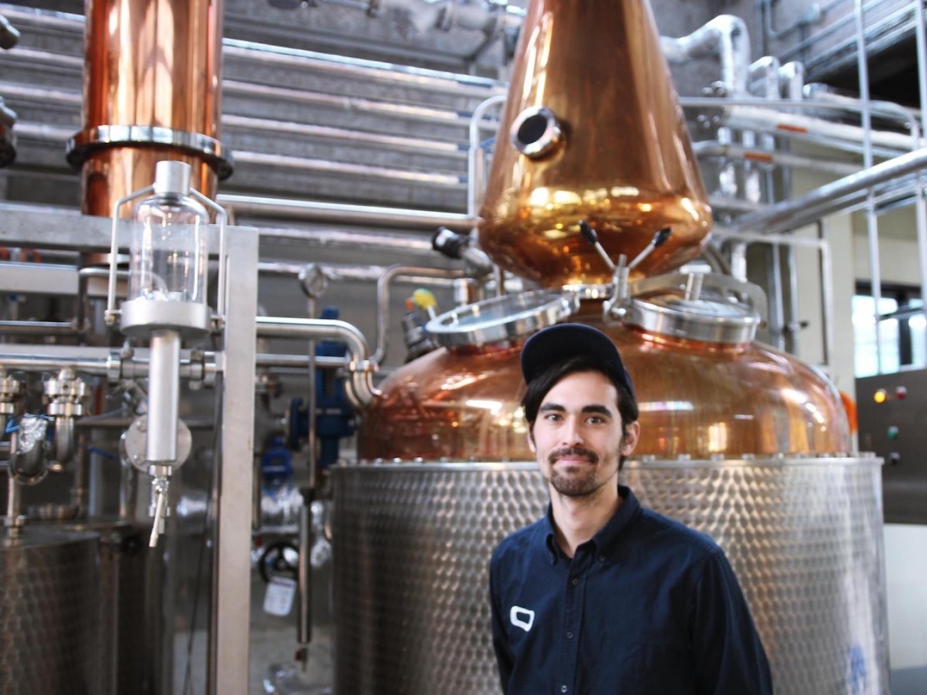 スコットランドと日本にルーツをもつサムさん。ここに来る前は茨城県の蒸留所で酒造りを行っていた。ドイツ・CARL社のポットスチルの前で。