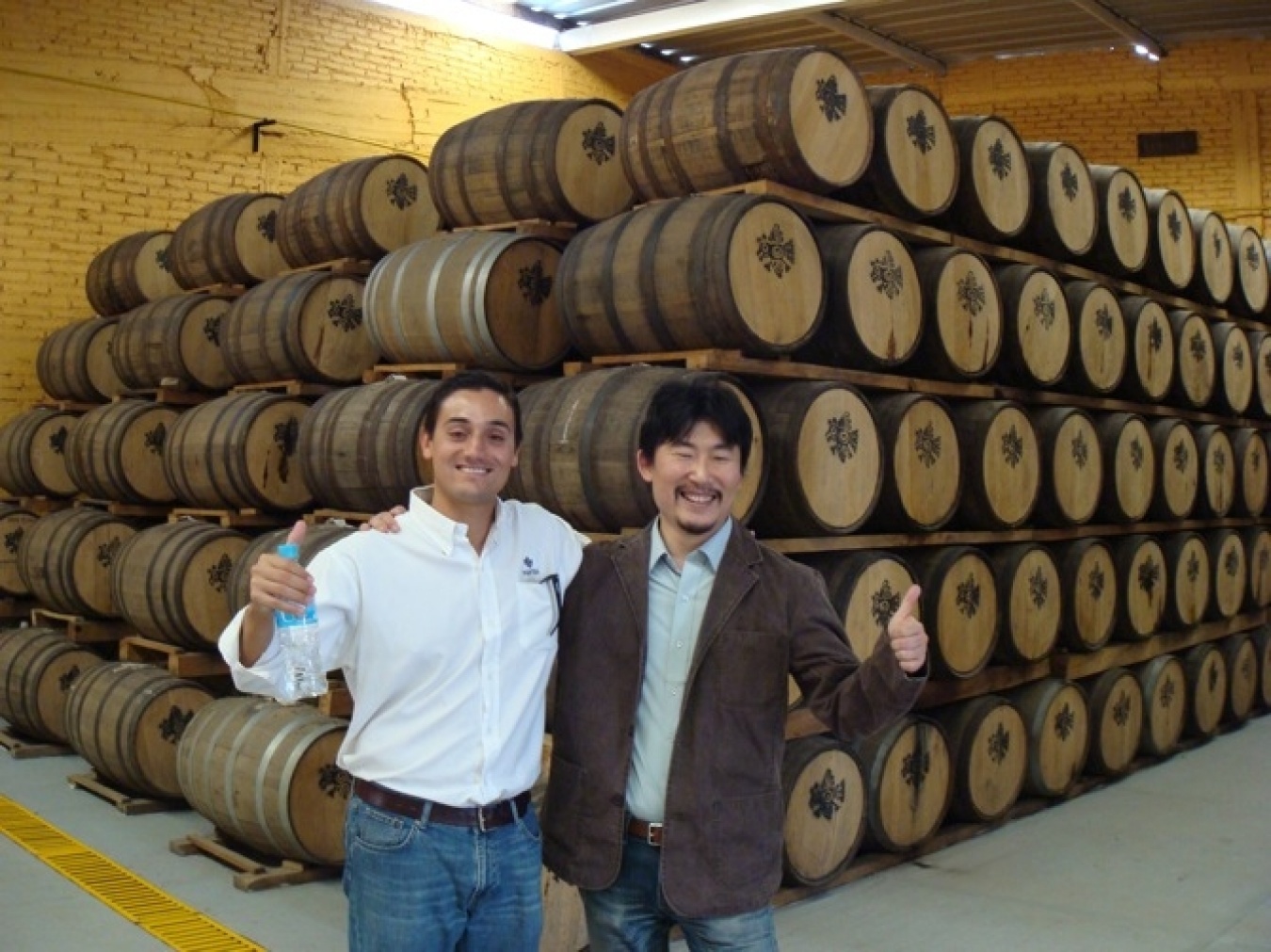 テキーラ・バルティーダのスタッフとテキーラの熟成樽の前で。このラテンなノリ、なるほどテキーラです。