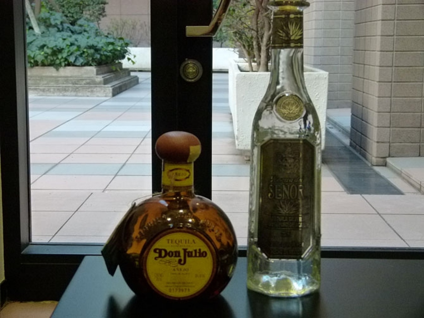 林さんの個人コレクションをご馳走になった。左は樽熟成した「ドン・フリオ」、右は「テキーラス・デル・セニョーロ」。噂のレゼルヴァ・デ・ラ・ファミリア(ファミリー・リザーヴ)である。