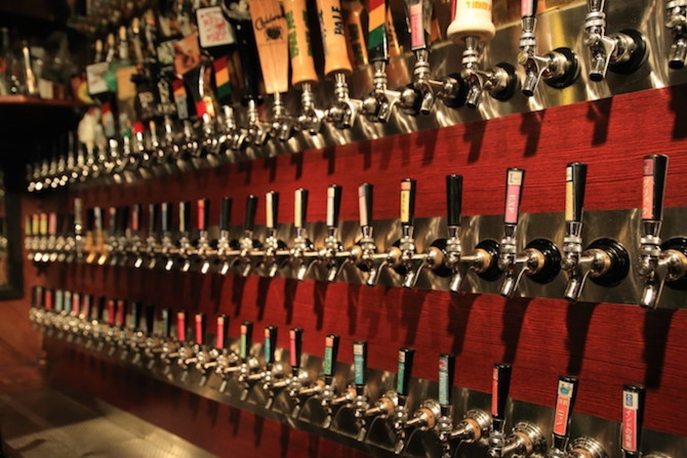 壁面にずらりと並ぶタップ、その数およそ70種!店内の黒板やポップで、その日のお薦めの銘柄をチェックすべし。Photos by Tetsuya Yamamoto