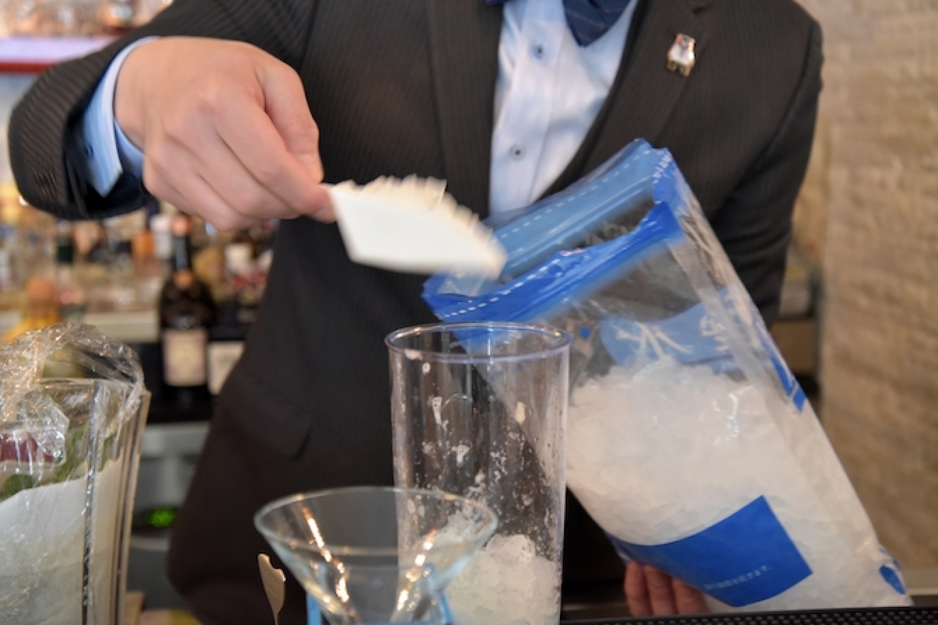 炭酸氷をミキサーに入れる。こんな光景がバーでの日常になるかもしれない。
