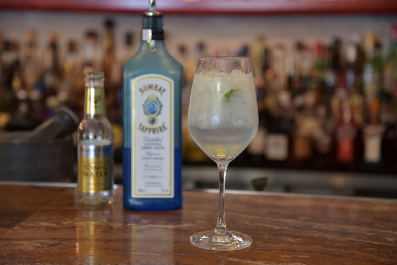 ジントニックは弾ける炭酸が楽しめるよう、ワイングラスでサーブ。シュワっとした口当たりがジンの香りを引き立てる。