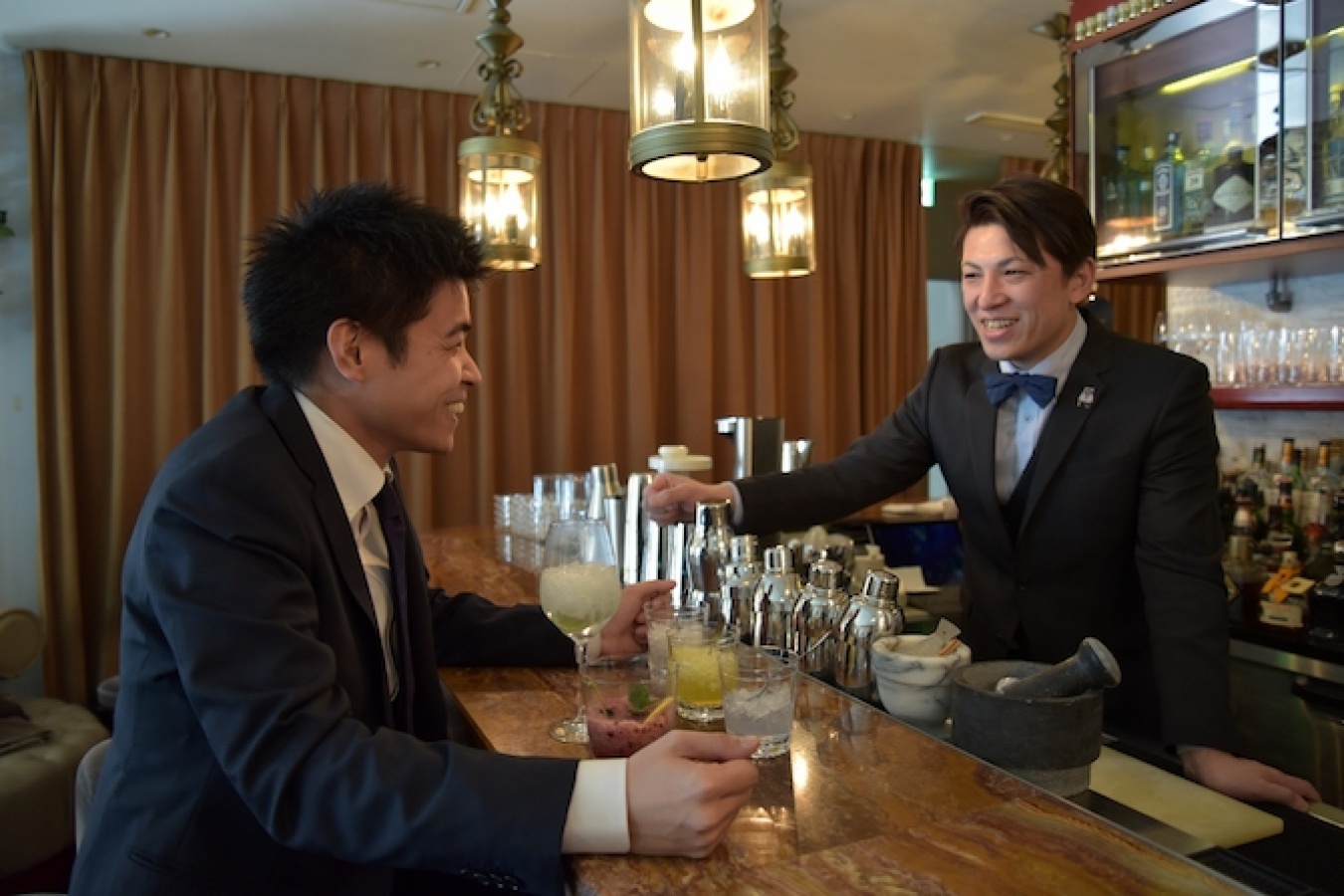 竹野さんとバーテンダーの深水さん(右)。バーは門外漢という竹野さんにとって、深水さんは良き理解者であり相談者でもある。