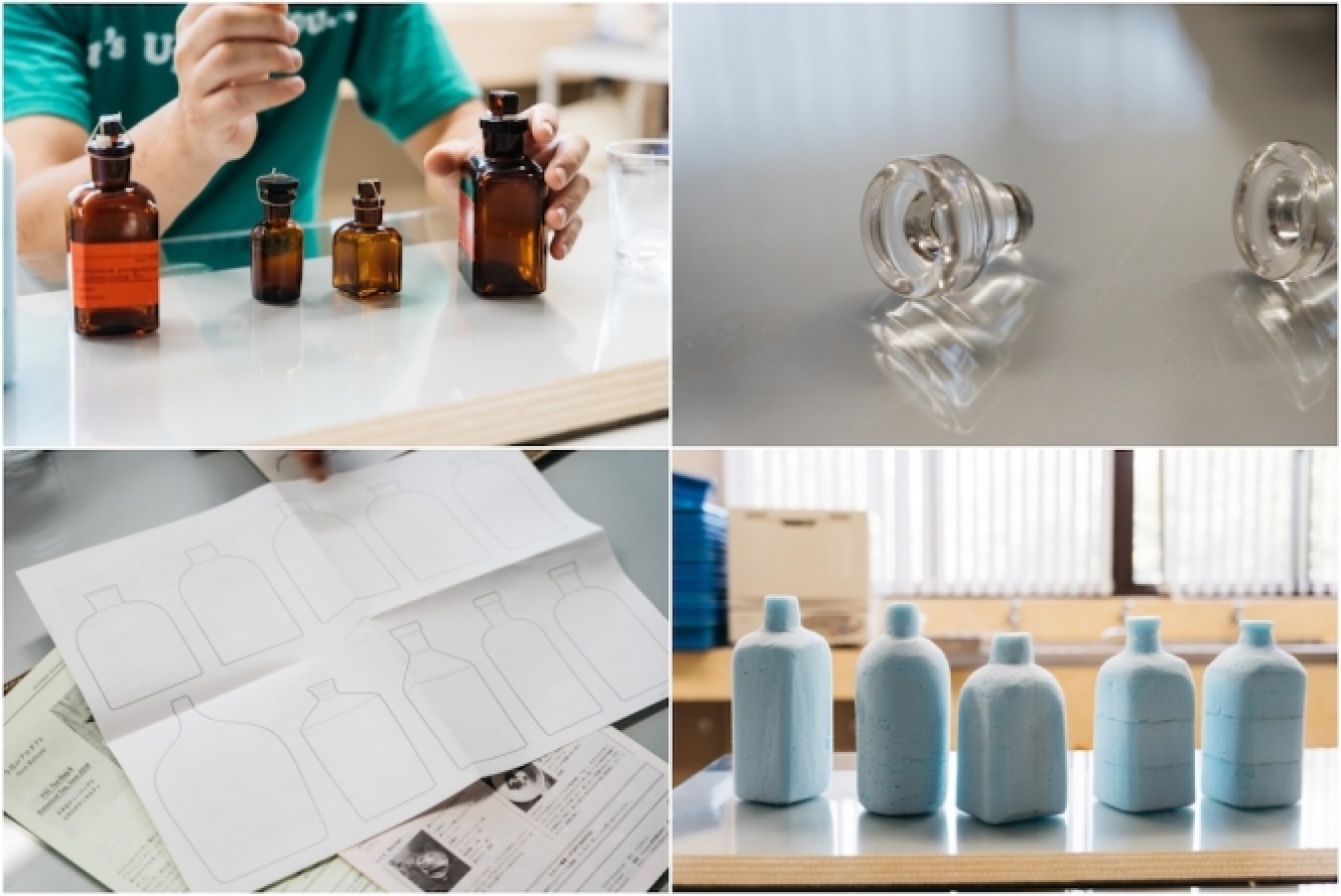 古い香水瓶をいくつも手元に置き、モックを作る。