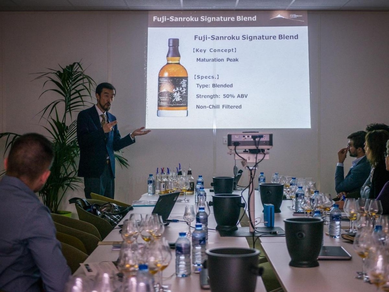 パリの卸売業者向けに開催したセミナーの1コマ。原酒の試飲を行いながら、富士御殿場蒸溜所の原酒のつくり分けと商品特長についての説明を行った。