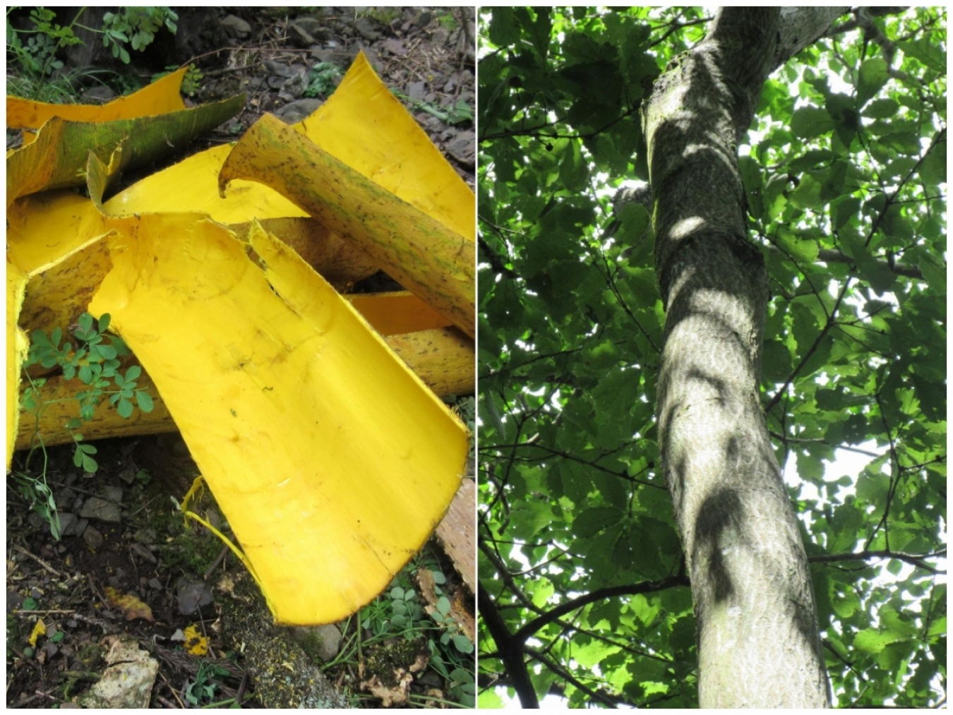 鮮やかな黄色が特徴的なキハダの樹皮(左)。「現在でも山深い山間部に生えています」。