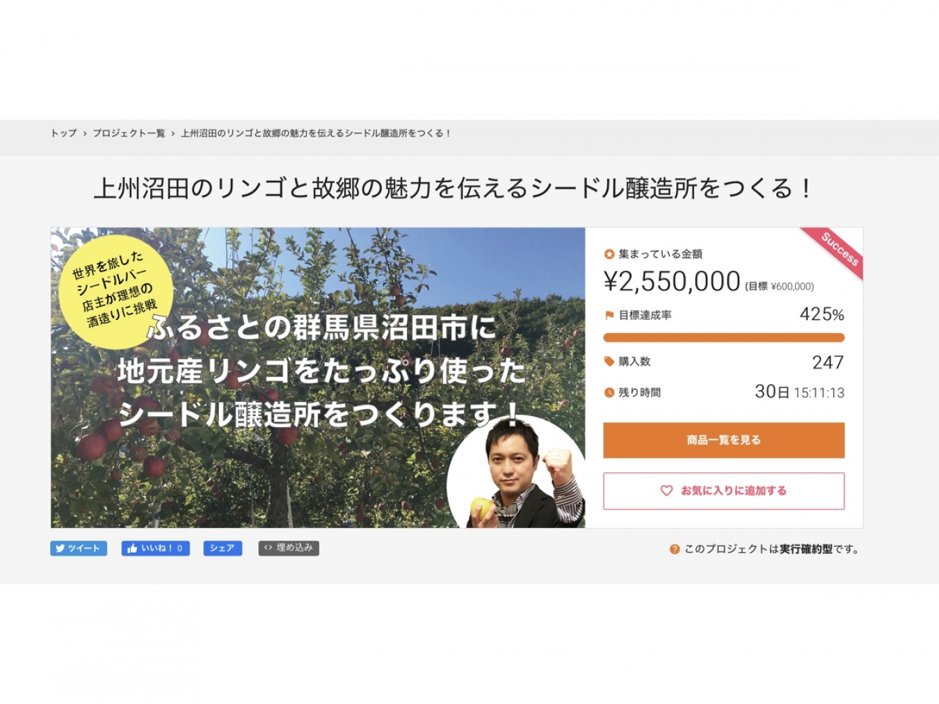 こちらはクラフトシードルのプロジェクト。スタート早々に400%を超える支援を集めた、注目のプロジェクトだ。募集は5月14日まで。(支援の内容は4月14日現在のもの。)