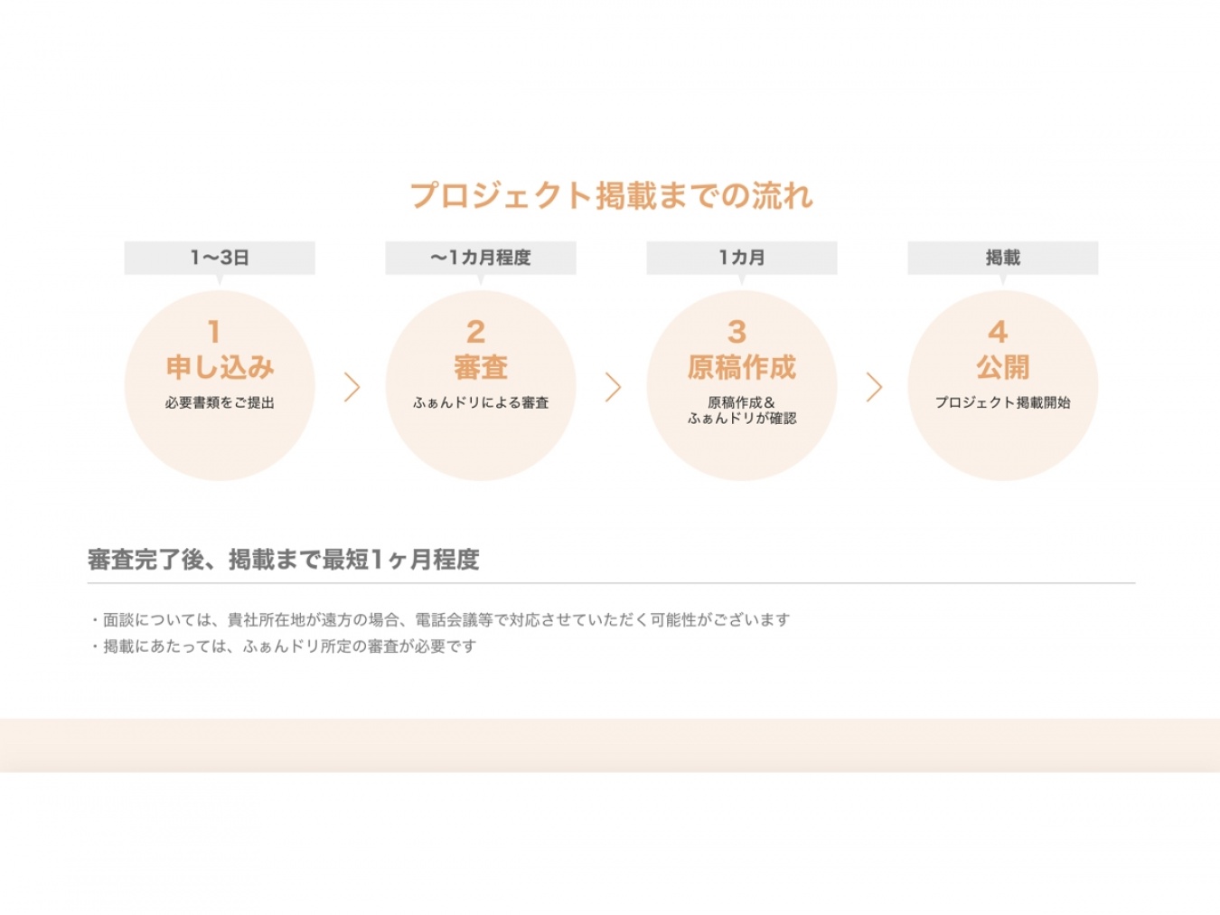 プロジェクト立ち上げから掲載までの流れはこんな感じ。