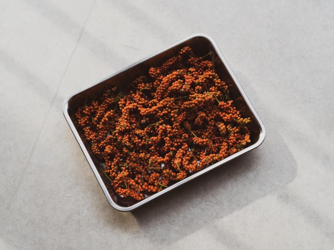 こちらは日本のコショウことフウトウカズラ。温暖な沿岸部に自生する植物で、その実はコショウのような爽やかな辛味と柑橘の皮のような苦味をもつ。千葉県の「苗目」産のフウトウカズラから一粒一ずつ手で採取して塩漬けにしたもの。昨冬、“森の生コショウ”として期間限定発売した。