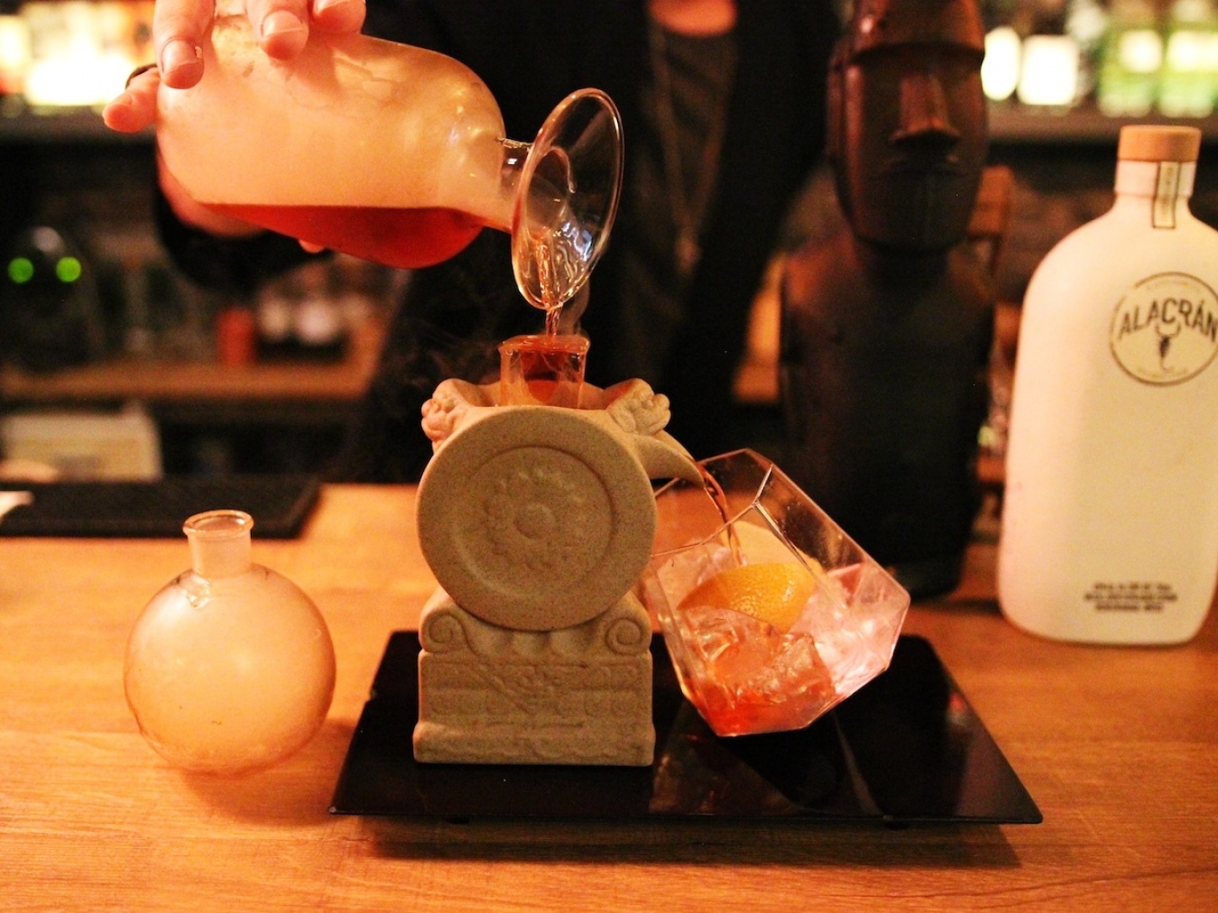 シグネチャーカクテル「Aztec Negroni」。ローズマリーのスモークとともに。石のオブジェのようなうつわもポイント。