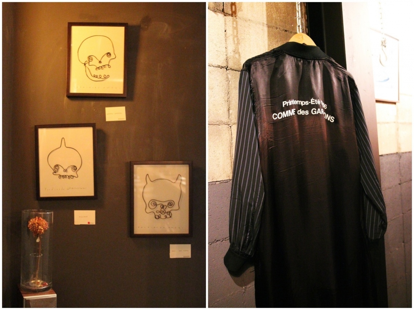 ギャラリー風にしつらえた店内。この日は石川県の画家、大森慶宣さんの作品を展示していた(左)。ファッション好きが垣間見える私物のコート(右)。