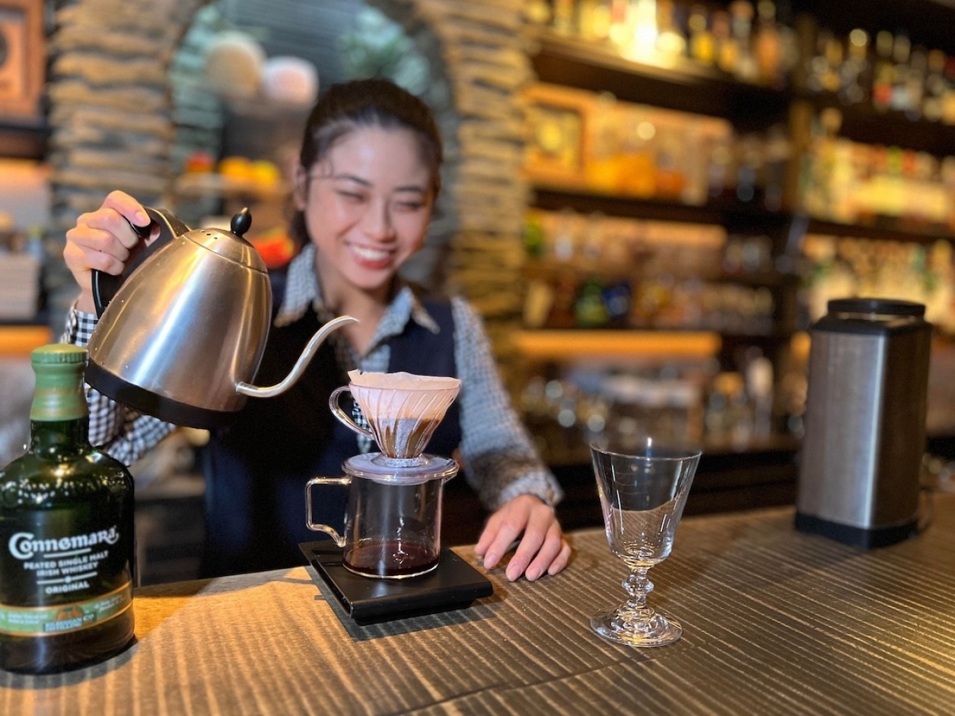 「Bar Amber」でコーヒーを淹れる岸田さん。