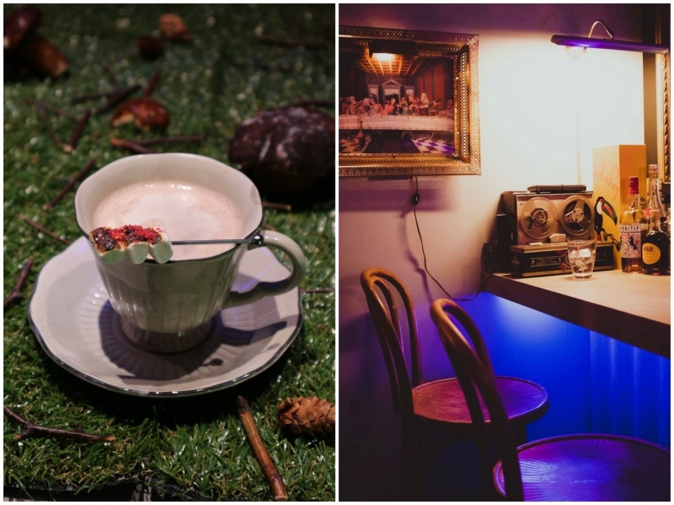 左は寒い季節にぴったりのカクテル「ポルチーニ&チル」。右は「Niwaka bar」内観。カウンター8席のみという小さくて居心地のいいスペースだ。