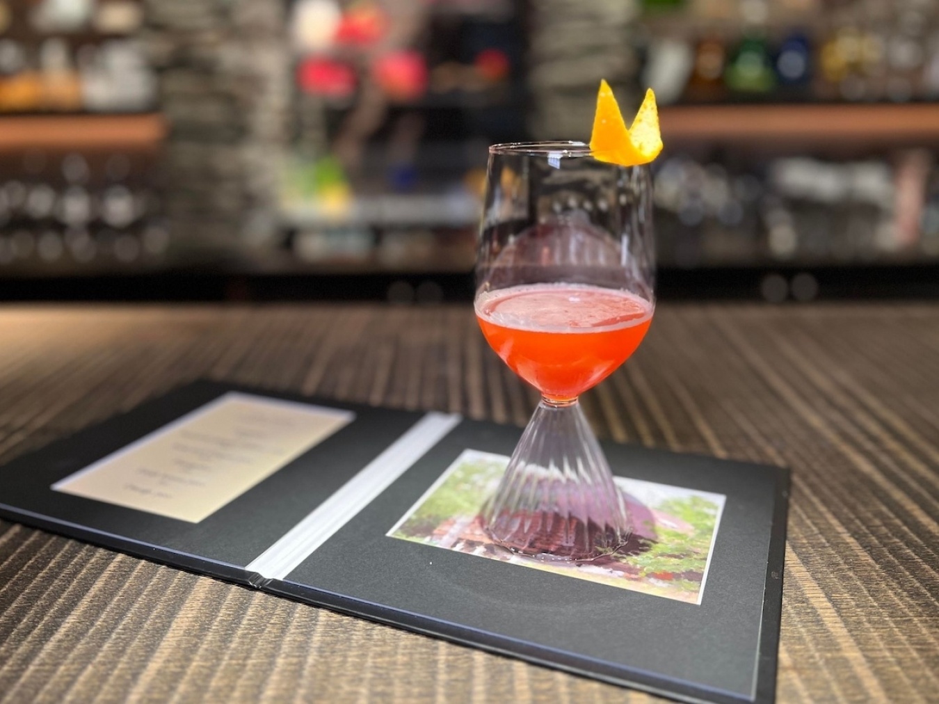 「カンパリグループ・カクテルグランプリ2022」のために考案した岸田さんのシグネチャーカクテル「Casa nostra」。カンパリに実山椒をインフューズドしたジン、蕎麦とブドウのジュース、ブランジェリコなどを合わせた、さっぱりとしたカクテル。