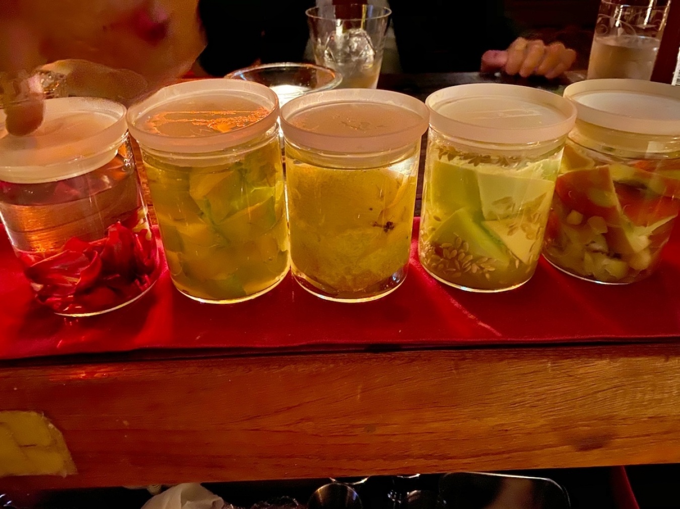 バーテンダー時代から、さまざまなハーブやフルーツをリキュールに漬け込み、香りや味わいの引き出し方を試していた。左から、ソルダム、アボカド、スターフルーツ、メロン、ドラゴンフルーツ。
