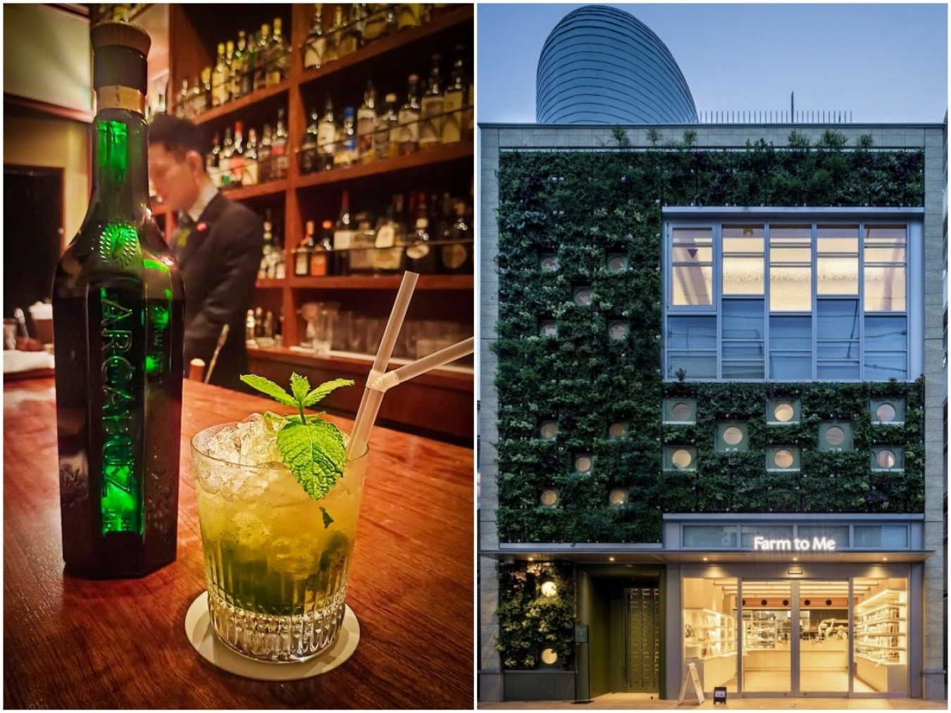 「ARCABUZ」の特長を活かしたモヒート(左)。「ARCABUZ」と同じサトウキビから造られたシロップ・デ・ケーン(さとうきび蜜)を加えている。人形町の「Bar内藤」が考案し、同店や「Farm to Me」(右)で提供中だ。