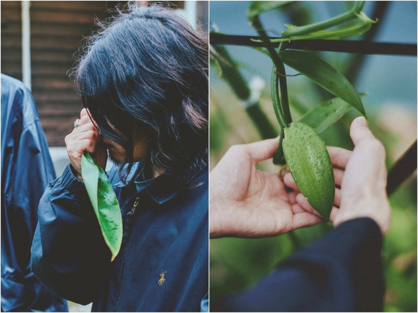 左:カシャの香りを嗅ぐ西村さん。右:島内で栽培が始まったバニラ。今後、「Botanical」に使われる予定だ。