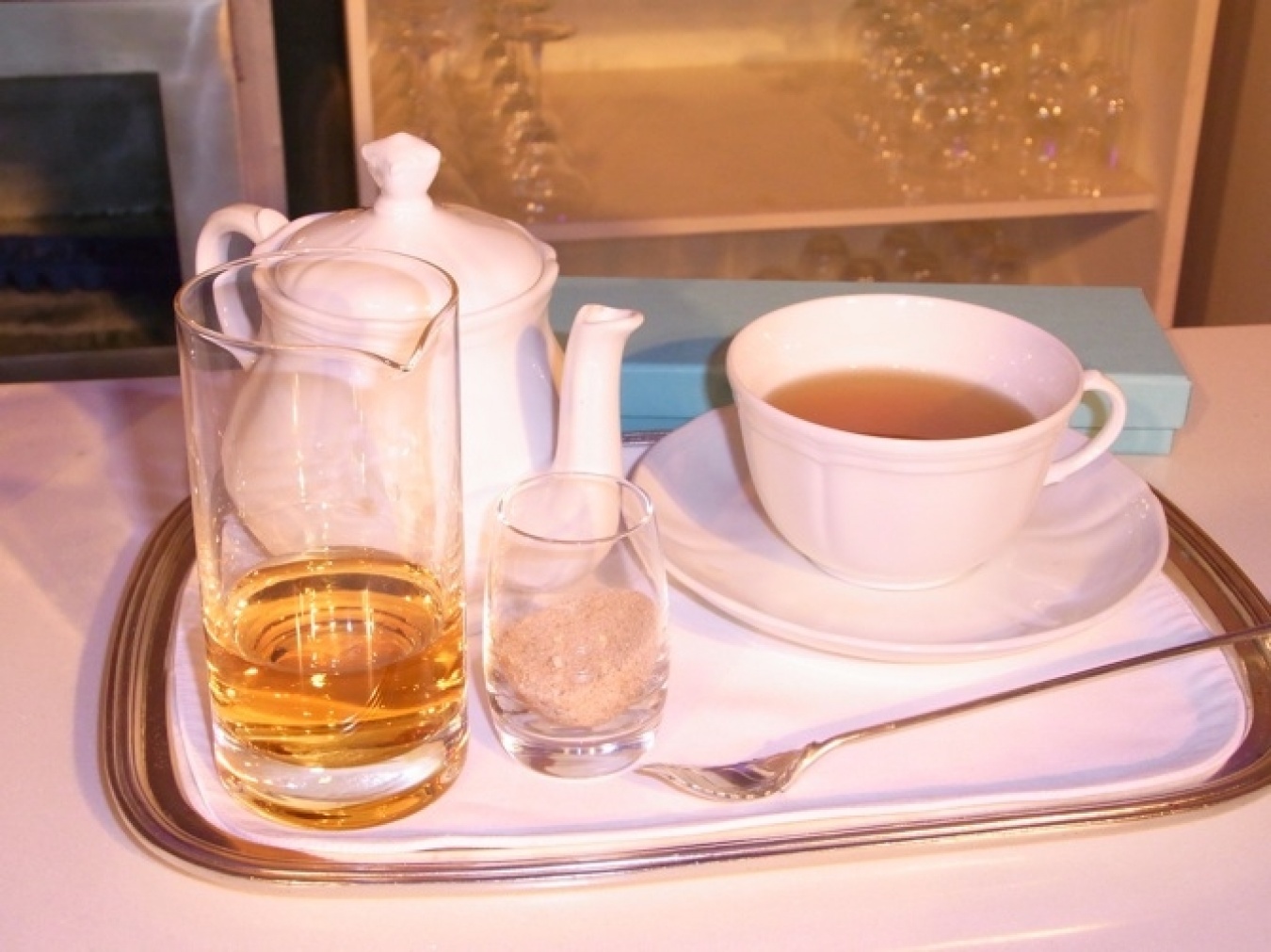 愛用の、ティファニーのアンティークのティースプーンを使ったカクテル「Holly's tea cocktail」。シナモンシュガー入りのアッサムティーにジョニー ウォーカー・ブルーレーベルとレーズンシロップを加えて。ティファニーだけに、カクテル名も「Holly」!