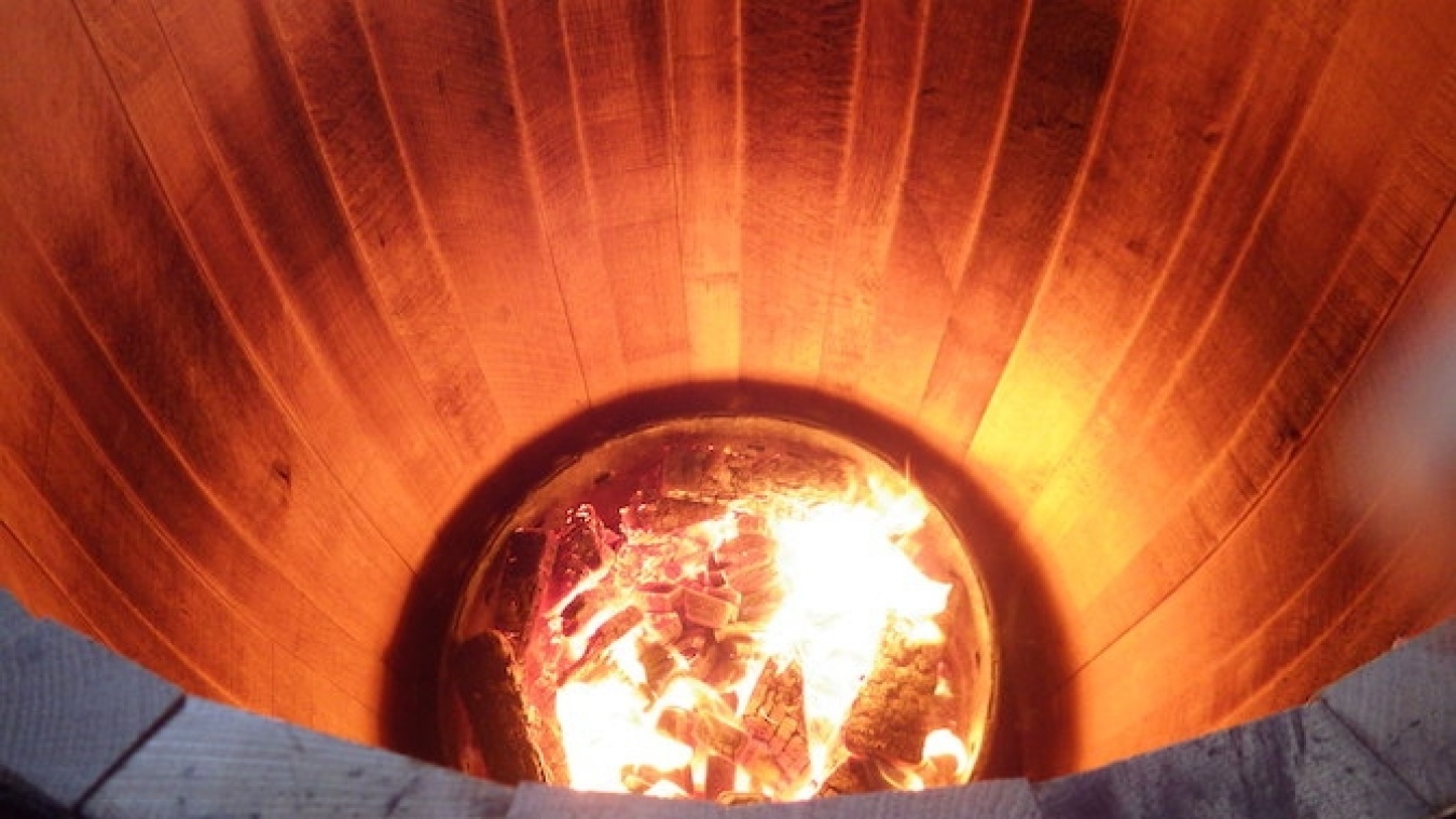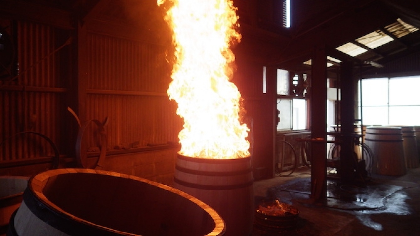 曲げ加工を施して成形した樽を種火にかぶせ、内側を焼く。蒸留酒用はチャーリング、醸造酒用にはトースティングという加工を施す。