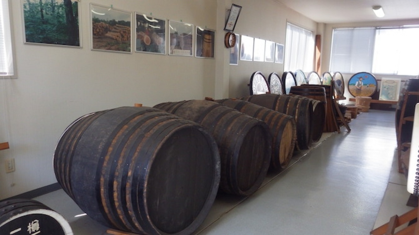工場内には古い樽をずらりと並べたギャラリー風の一角が。