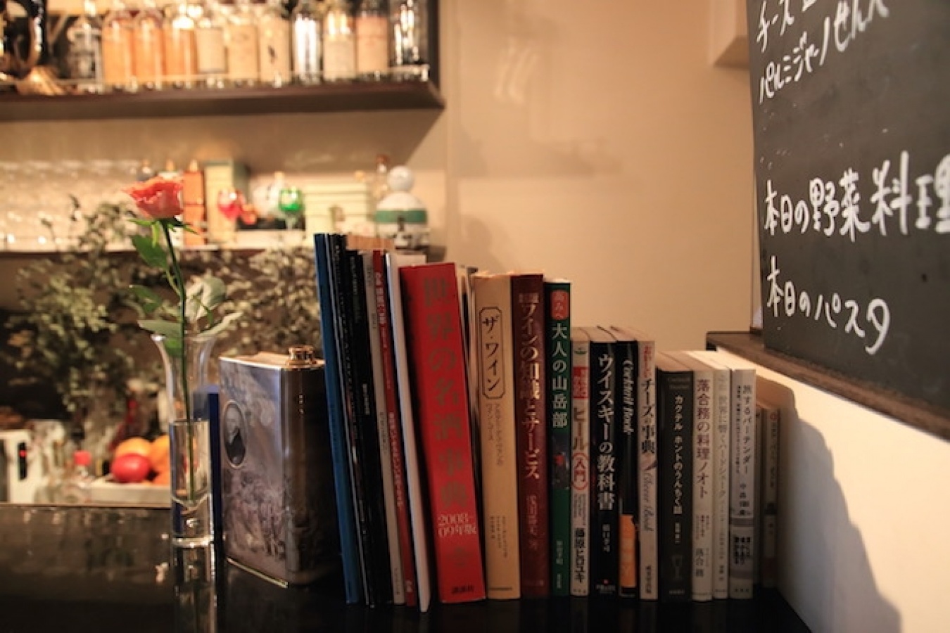 カウンターのいちばん奥は、高宮さんお気に入りの小さな「書棚」。「落合務の料理ノオト」から「日本山岳史」まで、高宮さんのパーソナリティを物語る本が並ぶ。