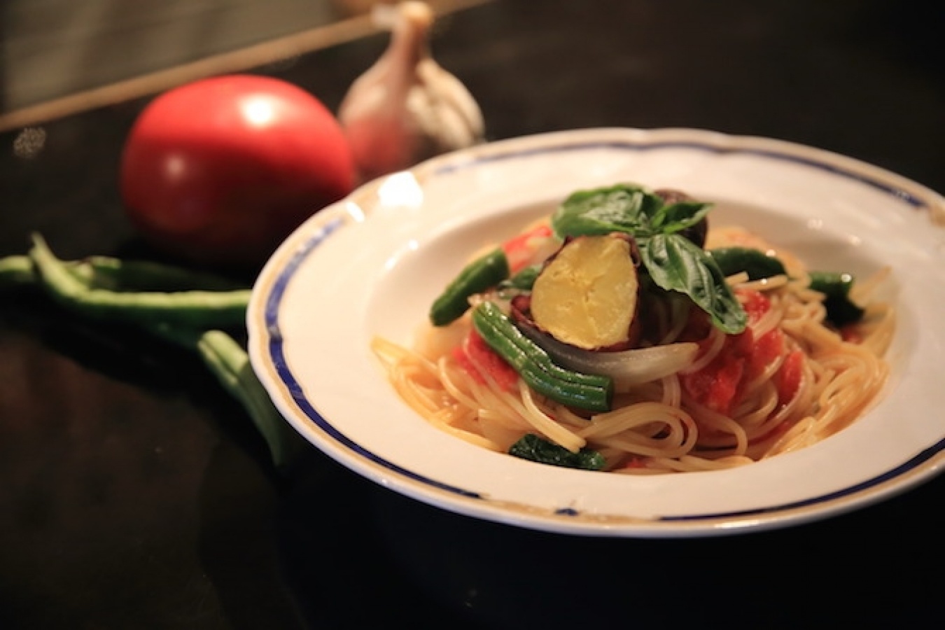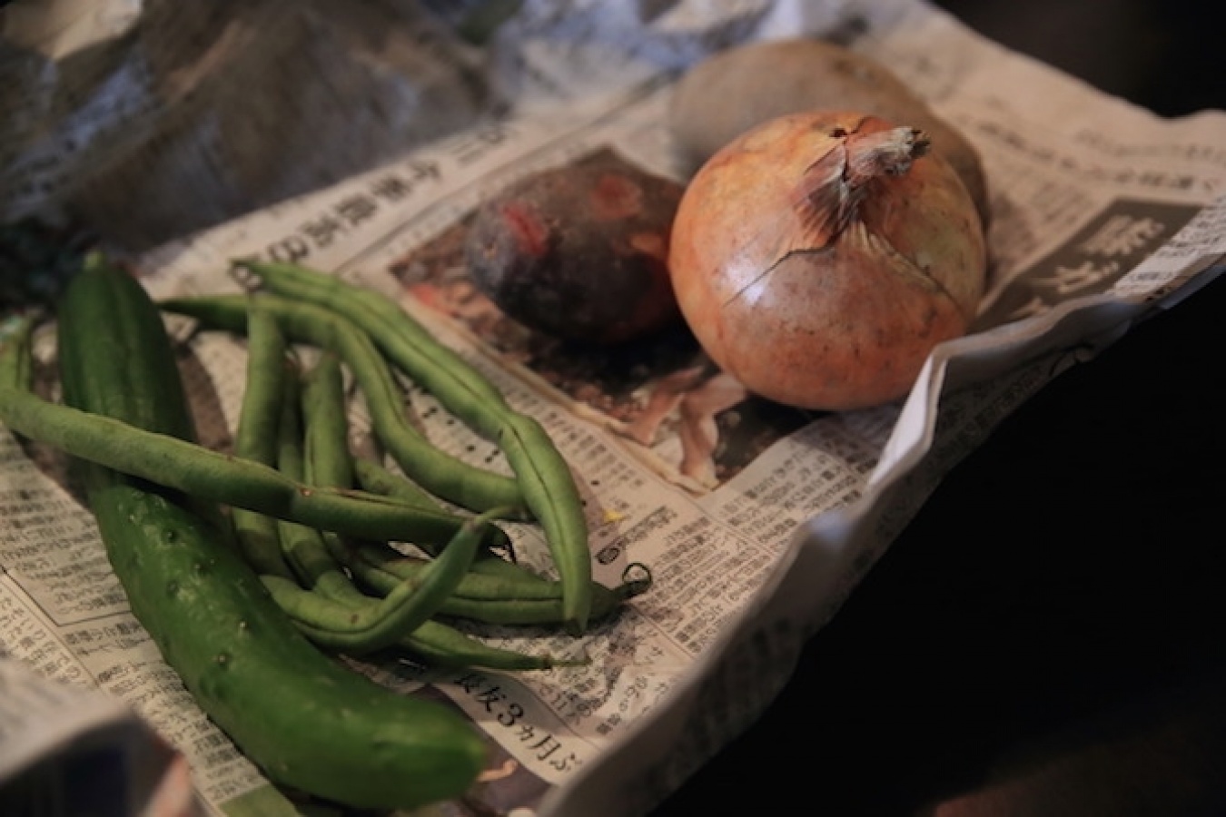 こちらは岡山県美作市の生産者から届いた野菜の一部。キュウリにインゲン、デストロイヤー(イモ)と玉ねぎ。カクテルの材料に、パスタに、あるいはつまみに。この店に野菜は欠かせない。
