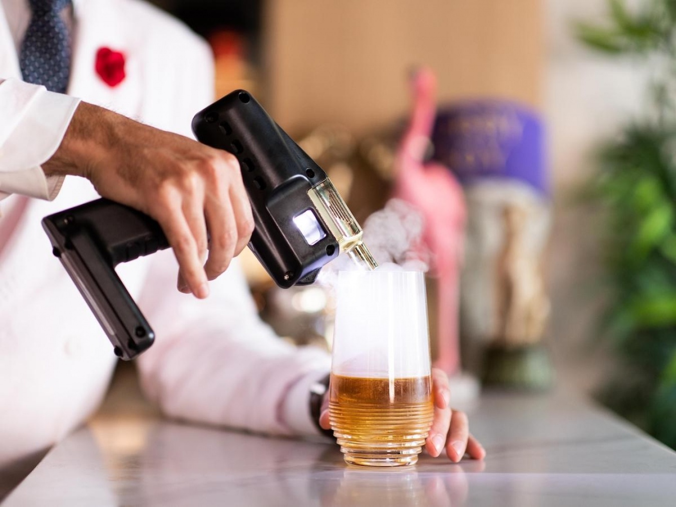 フレーバーとスモーク、バブルを瞬時に生成し、バブルのなかにアロマが香るスモークを閉じ込める。