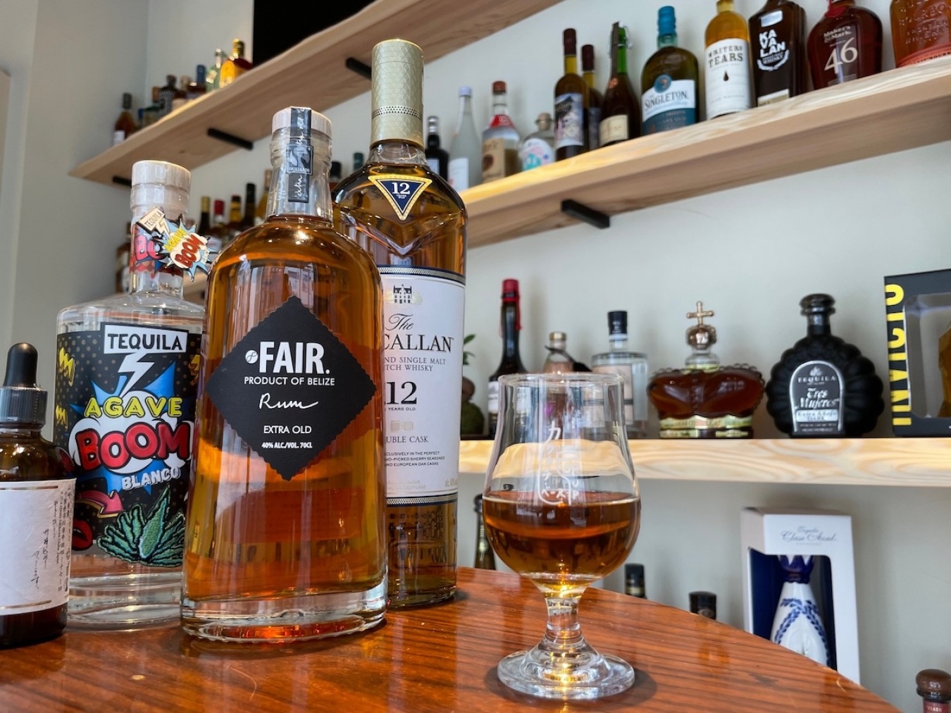 テイスティングスペースにはウイスキー、ジン、ラム、テキーラ、カルヴァドスからノンアルコールドリンクまで、希少な銘柄も含むこだわりのボトルが常時100種類以上並ぶ。