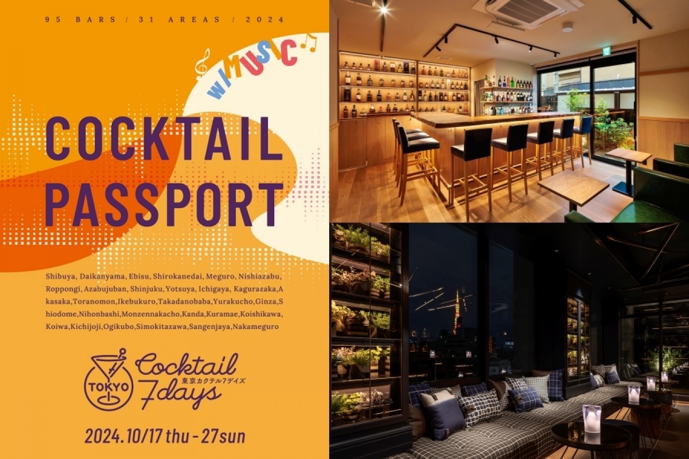 期間中には都内の参加バー95店舗で、「w/Music」をテーマにしたオリジナルカクテルを楽しめるほか、10月19日(土)& 20日(日)にはメイン会場となるVILLAGE のPOP UP BAR では、10ブランドのトレンドカクテルが体験できます。